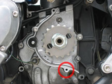 各モデルの最終型はクランクケースの形状が異なります。フロントスプロケットカバーを外しミッションカバーの形状を確認して下さい。丸印の部分にネジ穴がないモデルは取り付けが出来ません。 |